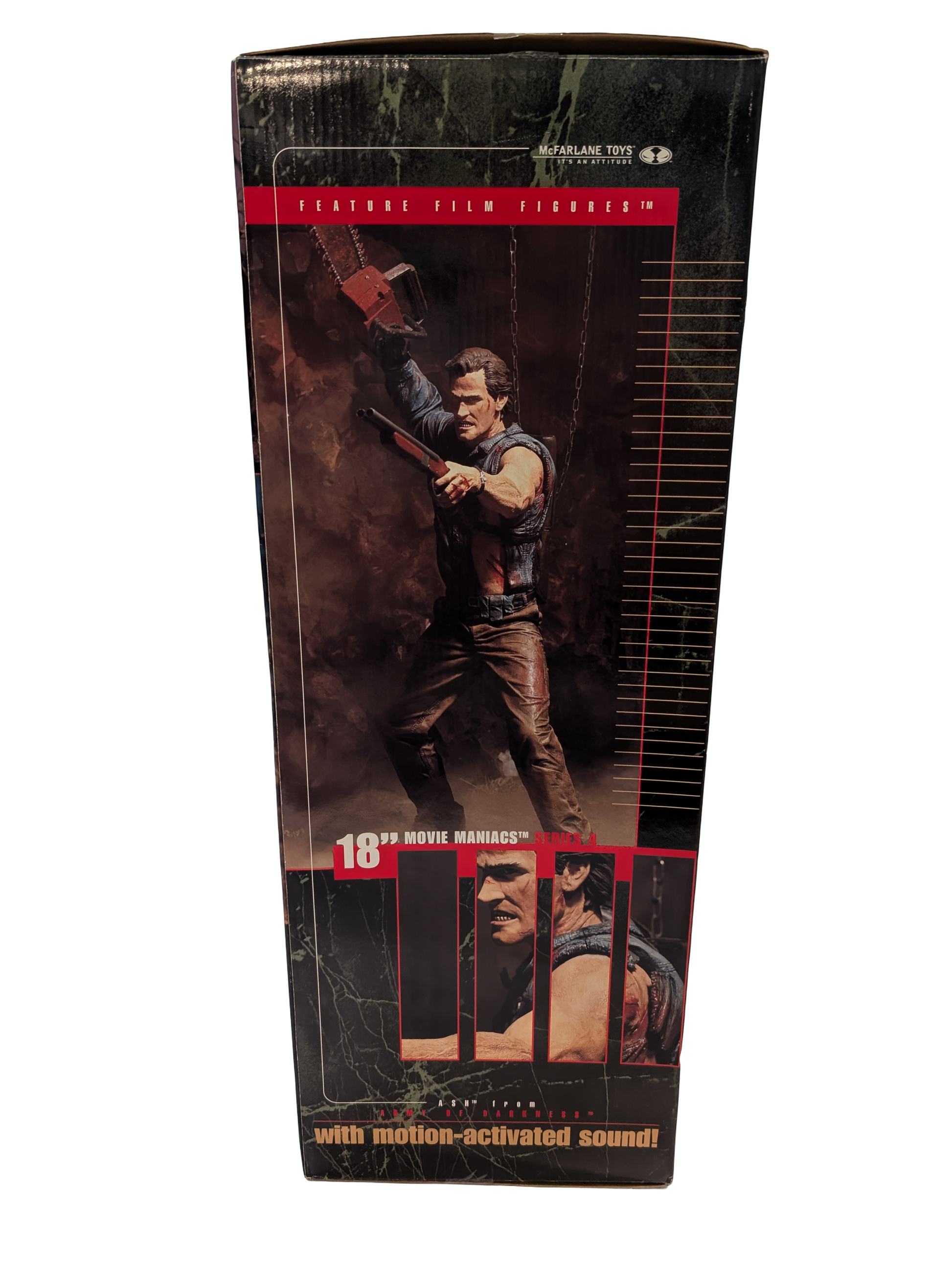 - Original Army of Darkness Movie Maniacs Box: The distinctive 2001-era packaging featuring motion-activated sound capabilities and classic film graphics.